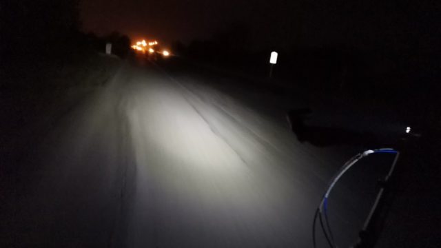 郊外路はこんな街灯もない真っ暗な場所が多いので暗い時は前照灯とバックライトは必須。