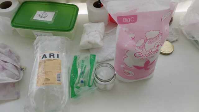 今回は新しい輸液パックと消毒&止血用の脱脂綿の準備。脱脂綿は普通のコットンを適当に丸めて瓶に詰めときます。