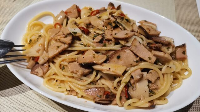 麺類が食べたくなったのでパスタ。消費期限切れのペペロンチーノソース2食分にスモークハム、エリンギ、にんにく、一味唐辛子を追加してパス260g(3人前)を作成。