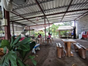 近所の簡易レストランで昼食。カオパットとガッパオ・ムーゴップ(カイダオ)ッス。