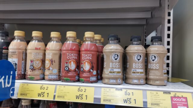 サントリーBOSSのLATTEが1BUY1の35バーツで売られていたが、自宅でアイスコーヒー作れば1杯2バーツなので買わなくてもOK。