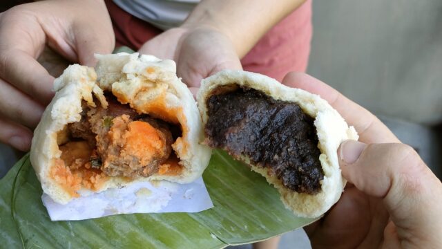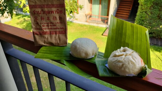 既にお腹いっぱいなので20バーツ(約80円)のサラパオ2個(黒豆餡、豚肉カイケム)を購入。