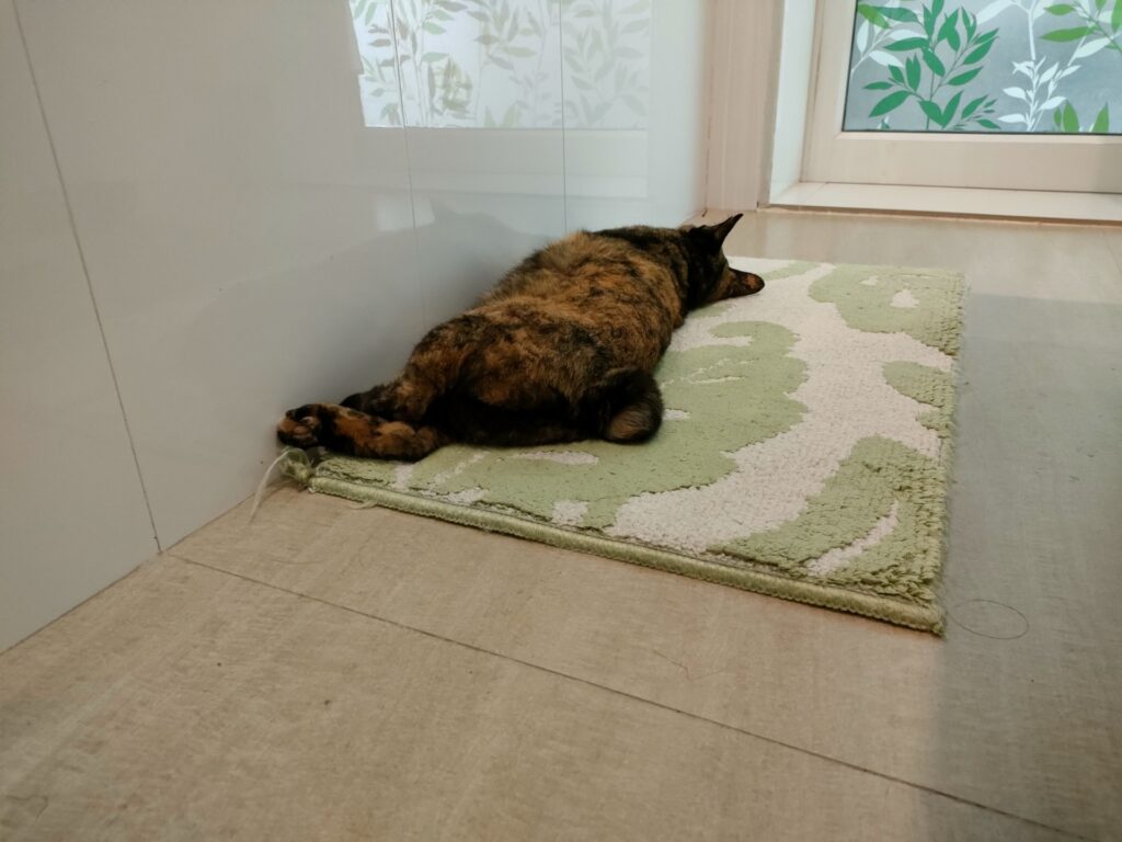 最近の暑さでプルさんは涼しいトイレの中で寝ることが多くなった。見た目はモチモチしているけれど食事量が減って寝ている時間が増えてきたね。