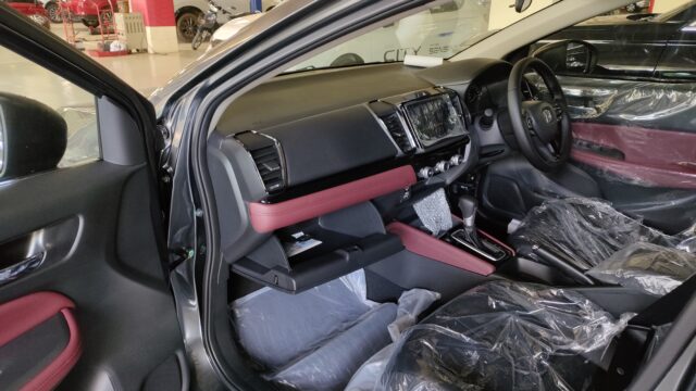 先日ハッチバックが有った場所にマイナーチェンジ後のシティが鎮座。基本と言うか展示車両はトップグレードの「RS」「e:HEV RS」で我が家が見たい中間グレードは置いてない。