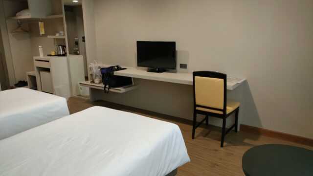 備え付けのスリッパも有って快適ですね。コーヒー、ポット、ドライヤーが有りましたがセキュリティーボックスは無いみたいです。