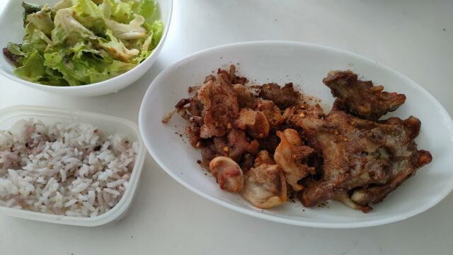 本来は安価な鶏もも肉を購入する予定であったが、骨付きもも肉1kg85バーツ(約349円)と値上がりしていて、見た目の鮮度も良くなかった。