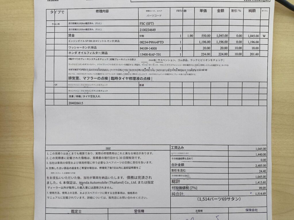 前回の1万km点検はオイル代だけの支払い(約1200バーツ)だったので、今回も似たような値段だろって書類を確認すると支払い4000バーツの見積もりになっていた。