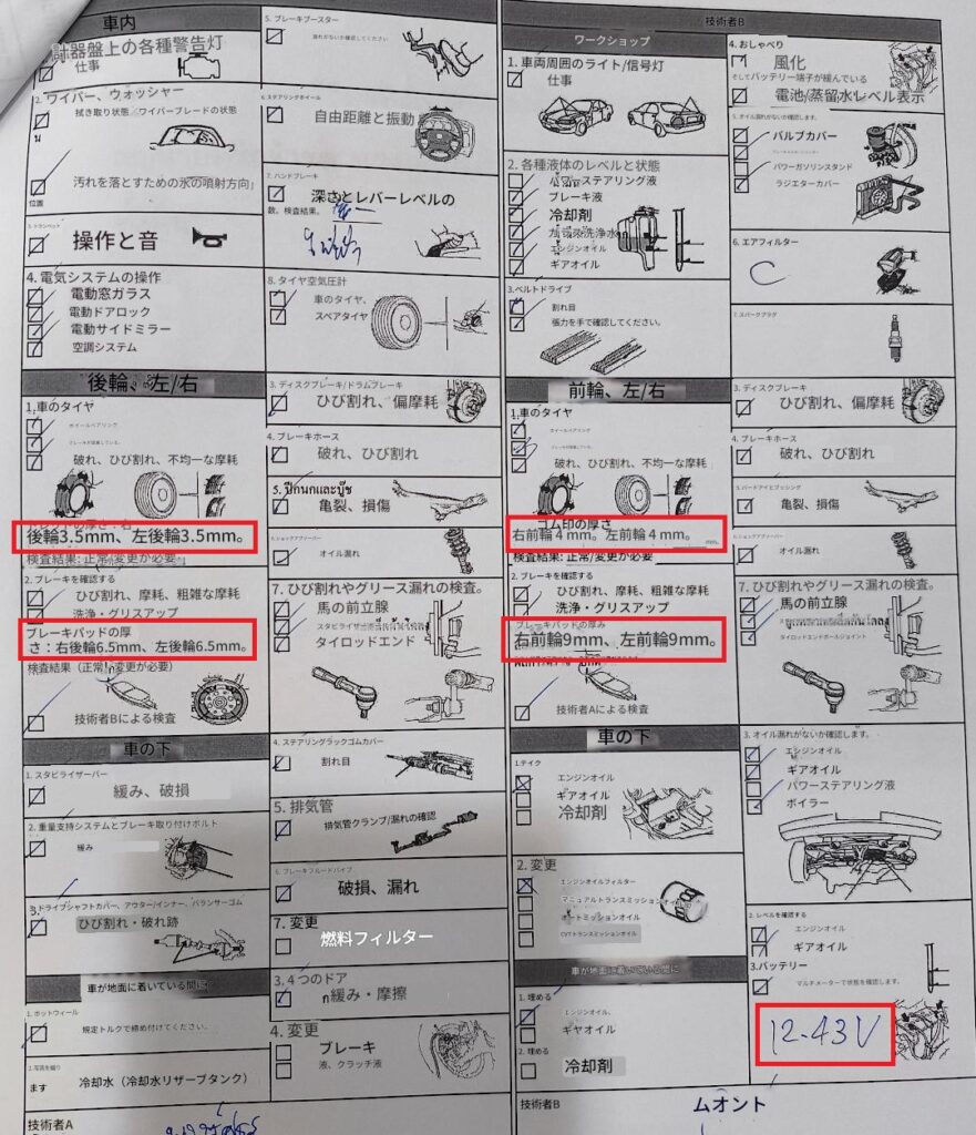 とりあえずタイヤの溝、ブレーキパッドの残り、バッテリーの状態くらいしか数値残らないけど、全て正常値って事でOKですな。