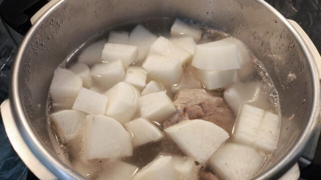 正式な作り方とか知らんので、豚骨が被るくらいの水を入れ沸騰後に灰汁を取り、適当に切った大根を入れて再度灰汁取して圧力鍋で15分加圧して自然冷却で蓋が開くようになったらナンプラーで味付けして、分葱入れて完成。