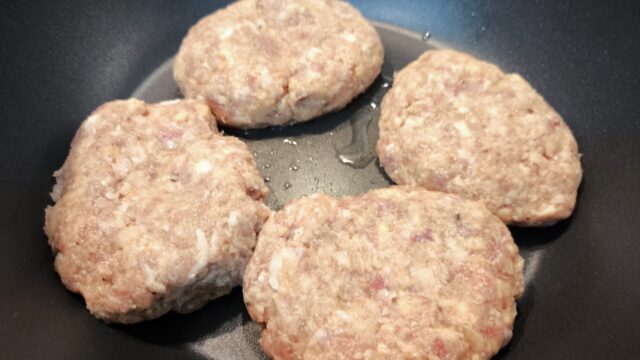 今回は炒めた玉ねぎとパン粉を増やして、やわらかい食感&保水とし、こねる時は氷水で冷やしながら作業し、こねた後に冷蔵庫で1時間冷却してから焼いた。