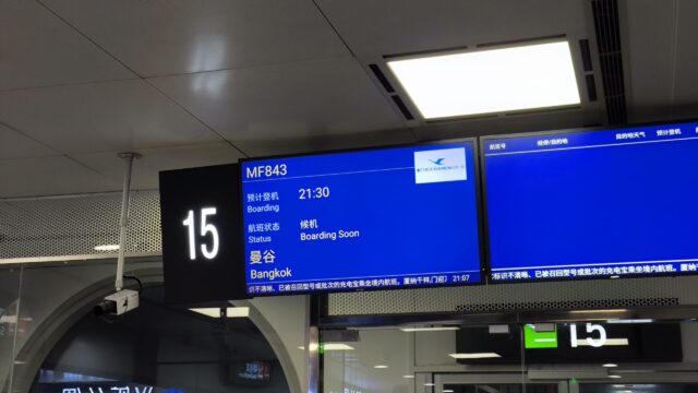 バンコク行きのMF843便は遅延なく出発です。