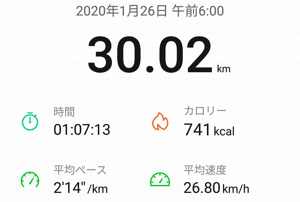家の手前で走行距離が29kmしかなかったので、少し遠回りしてギリ30km超えで目標達成。走行距離30.02km、平均速度26.80km/hです。