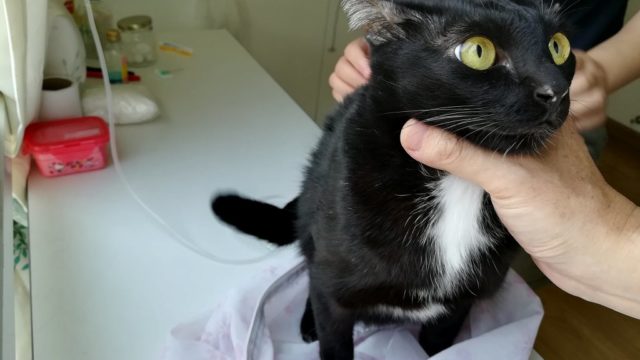 そして俺氏が黒猫ココロを捕まえて洗濯ネットに入れ、嫁氏がサクッと注射針を刺して点滴開始。