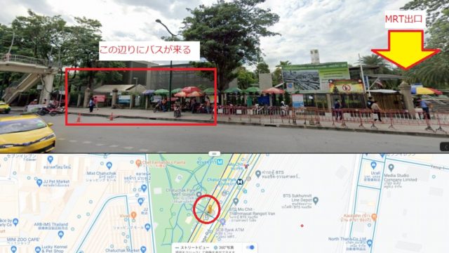 BTSでモーチット駅まで移動し、MRTチャトチャック駅出口のバス乗り場に向かいます。