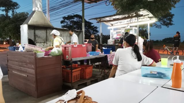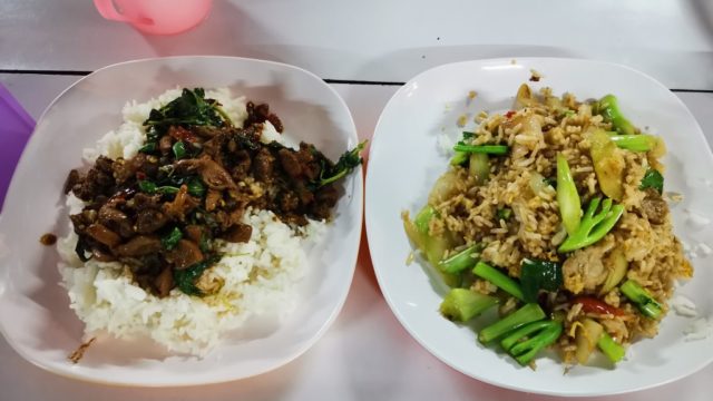 セブンイレブン横の屋台で晩ごはん。カオパットと鳥の内臓とバジル炒め。全部で60バーツ。