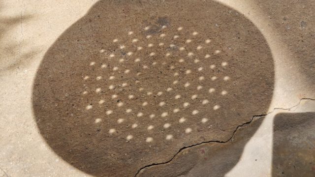 結果から言うと、ザルでも光が欠けているのが解るけれど、駐車場横の木漏れ日のほうが分かりやすかったです。普通は真っ直ぐな影が曲がって見えますね。