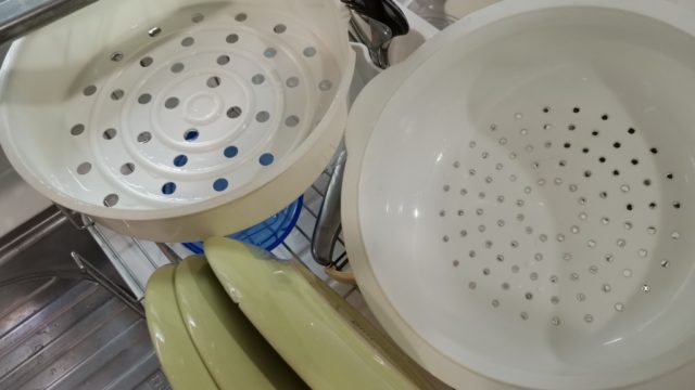 で、今日の部分日食ですが、日食観察用のグラスとかフィルム等を何も準備していなかったので、ピンホール効果でザルとか蒸し皿を準備。