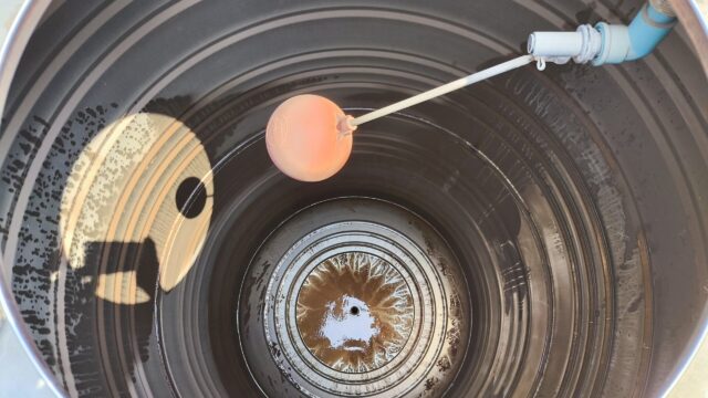 ある程度ミョウバンが溶けたら、水ポンプを使って水タンクに注入し数回繰り返す。