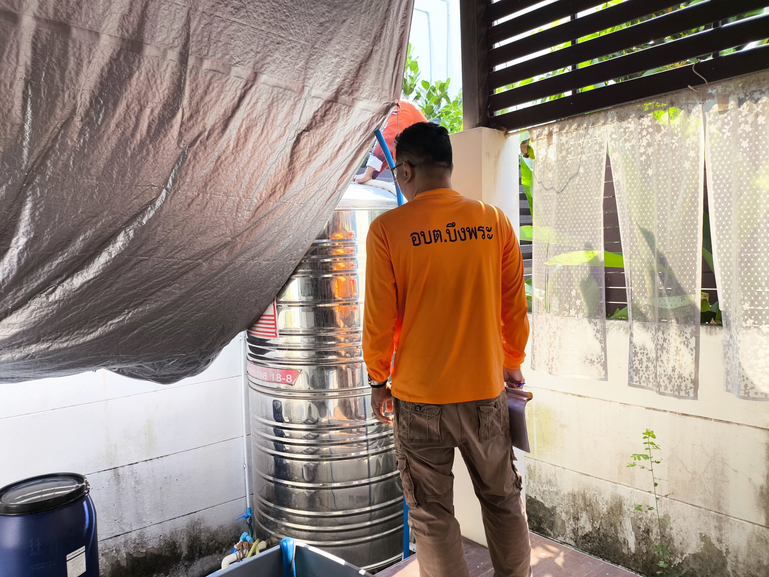 そして予定通り電話から1時間後に区の給水車が到着し、水タンクを満タンにしてくれた。