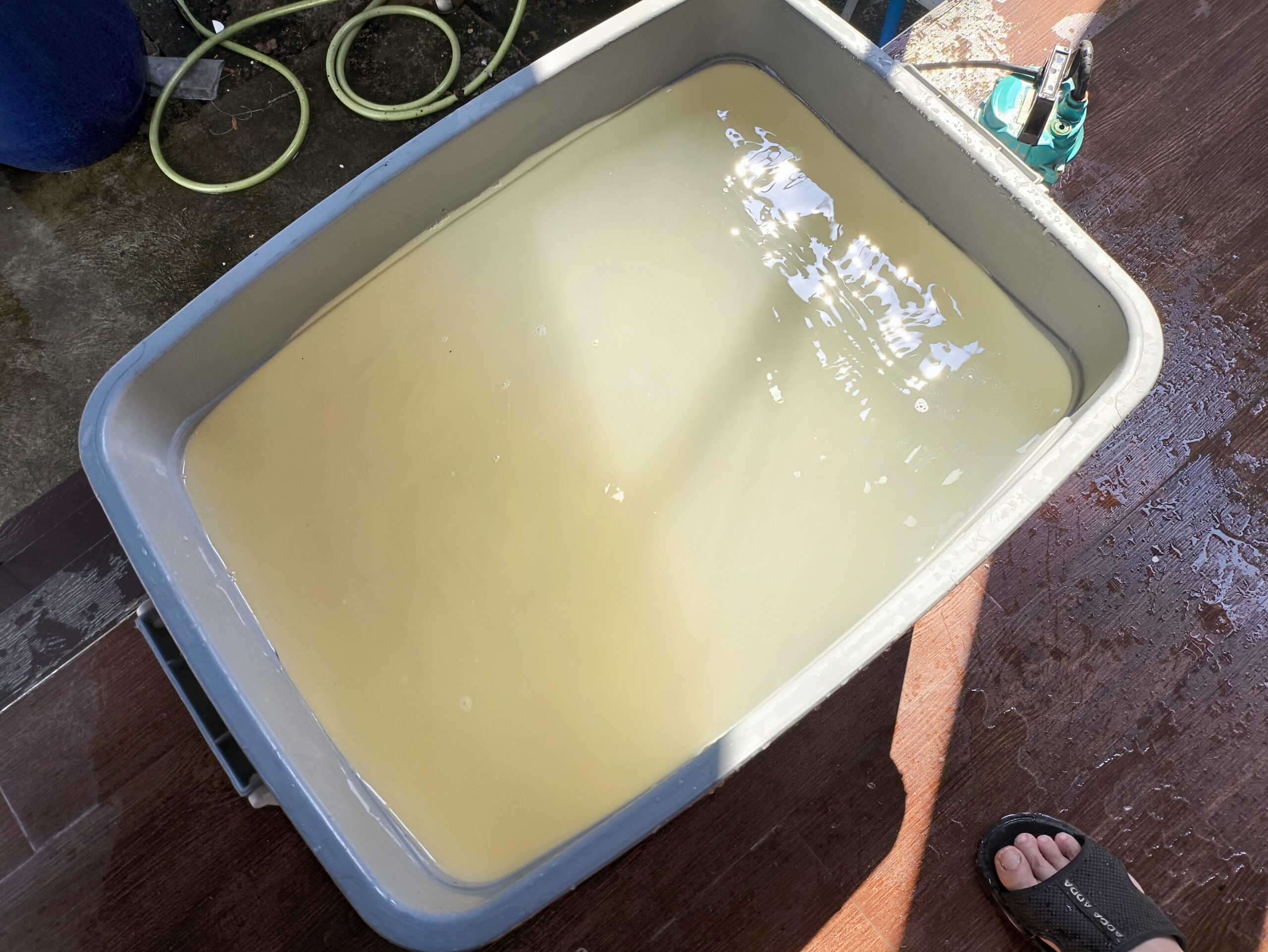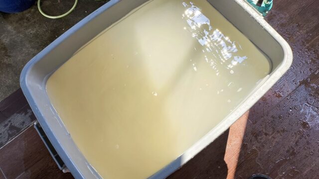 水タンクの泥水を衣装ケースに入れてミョウバンを溶かしていきます。