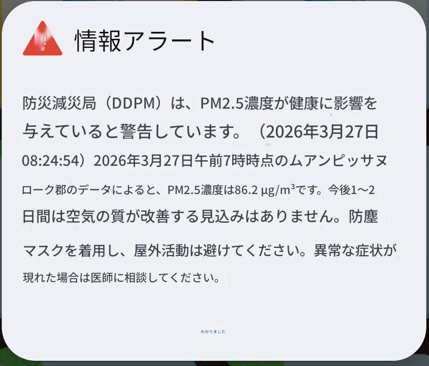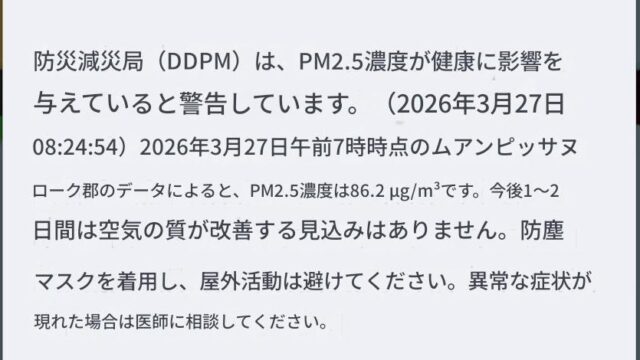 朝起きたらスマホにタイ政府の緊急警報が入ってきて何事かと思ったら「大気汚染が1~2日は下がらないのでマスクして外出控えて」な内容だった。