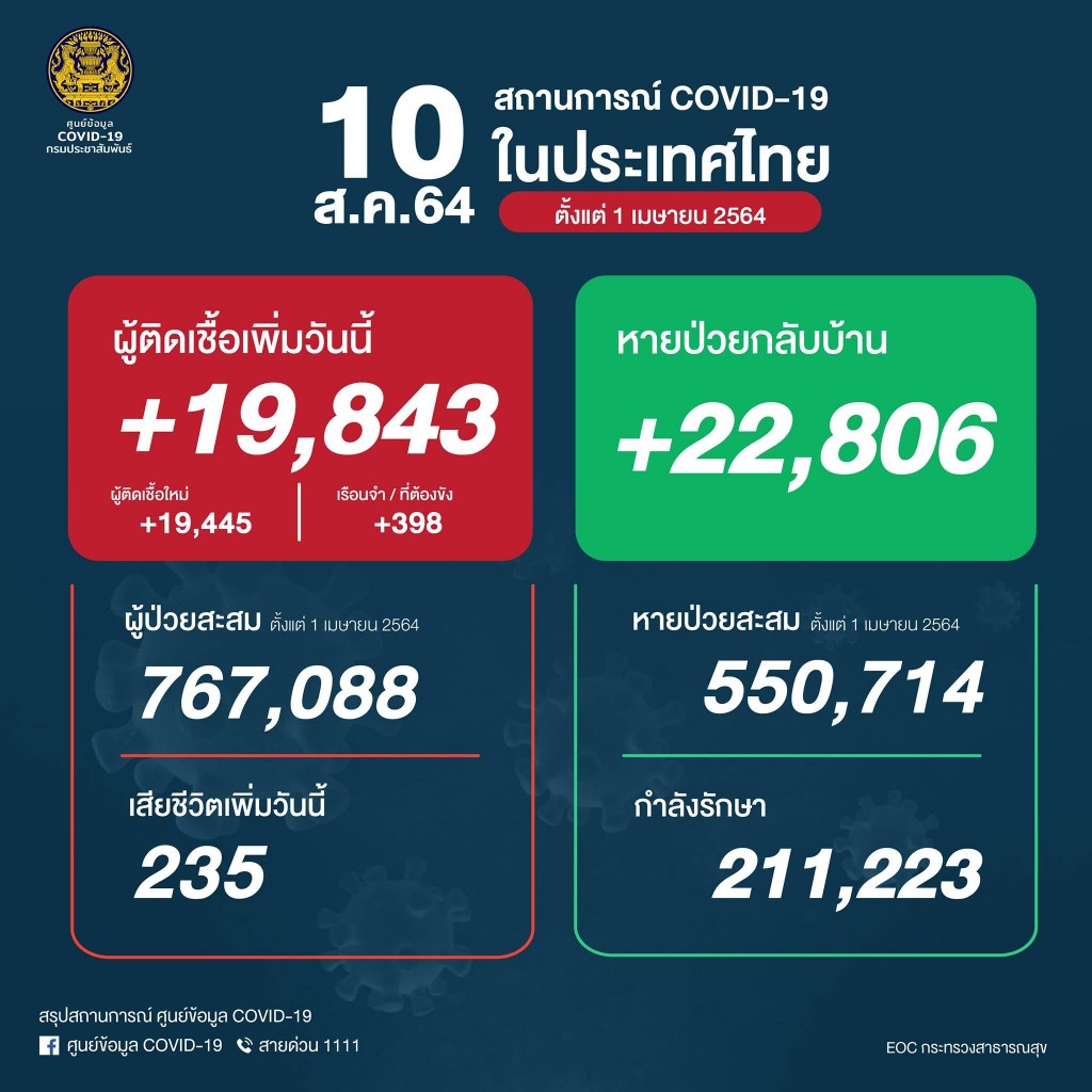 んでタイの新型コロナ新規感染者は19843人で死者235人。感染者は足踏み状態で死者は過去最大になる。