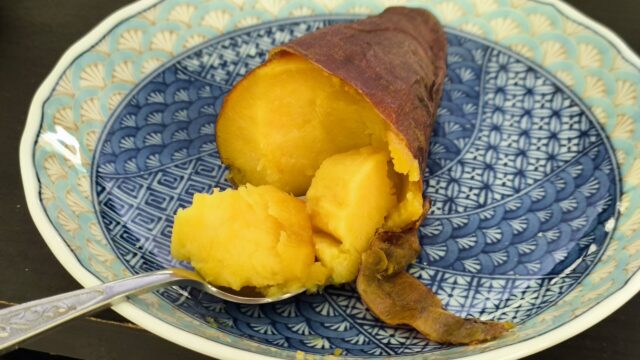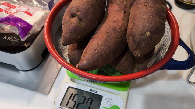 焼き方は芋を洗ってアルミホイルで包んで160度のオーブンで1時間、140度に下げて1時間加熱後にオーブンで2時間放置で完成。