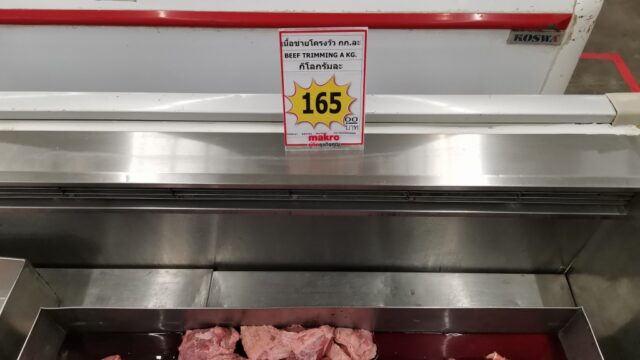 今回も豚タンを買おうと思ったら在庫切れで、代わりに「牛トリミング肉1kg/165バーツ」を約600g購入。