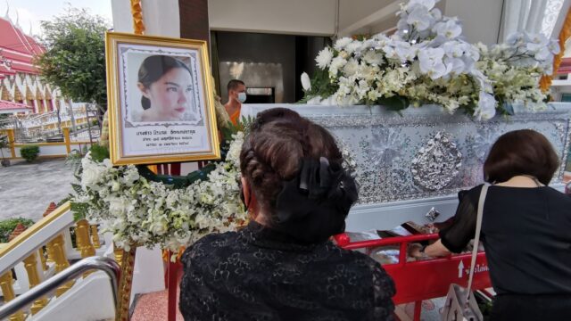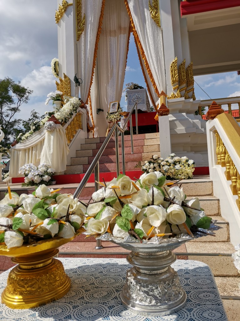 参列者が外に居ないので静かな感じの葬儀で、タンブンする人だけ祭壇までやってきて棺の間で僧侶に袈裟をタンブン。