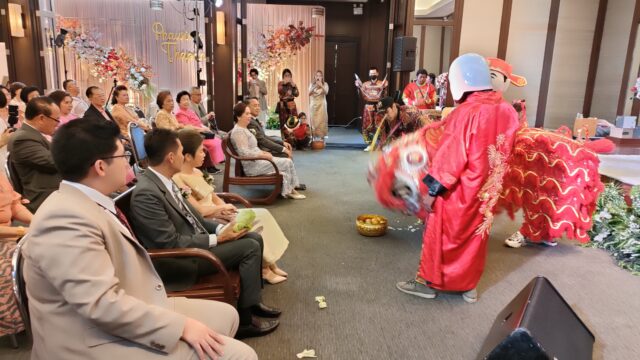 そして新婦側の通せんぼと押し問答の三文芝居が終わった後は結婚式会場で獅子舞の踊りが披露され、その後は夫婦の入場と親戚からの祝辞や結納を行い終了。