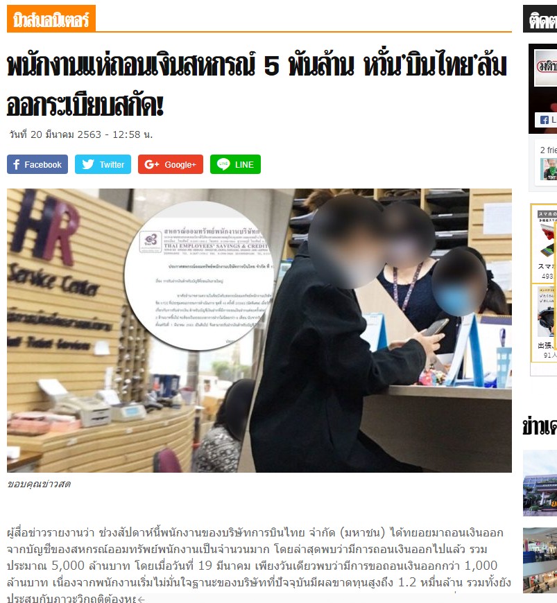 あと新型コロナウィルスのパンデミック前から赤字続きでヤバイヤバイと言われていたタイ航空ですが、タイ航空従業員の預金組合から預金を引き出す人で大混雑の模様。