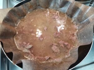 普通の牛すじの下処理って茹でこぼし2回だけれど、俺氏は「オーブン焼き&茹でこぼし」の組み合わせにしている。