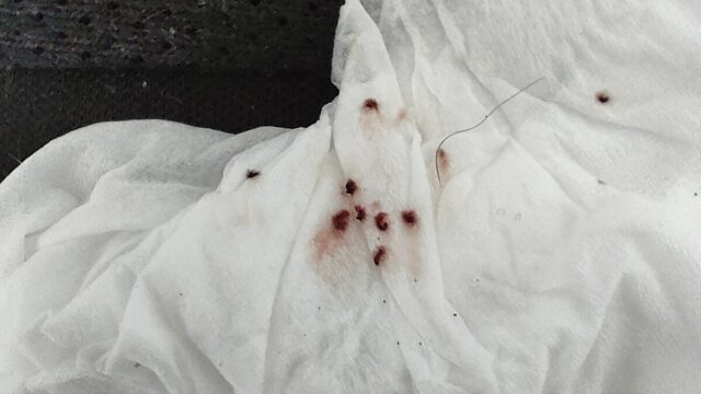 薬を入れた背中はノミ0匹だけど首元とかお尻周辺から初日22匹、2日目25匹、3日目7匹、4日目4匹と70匹近くのノミの捕獲に成功。