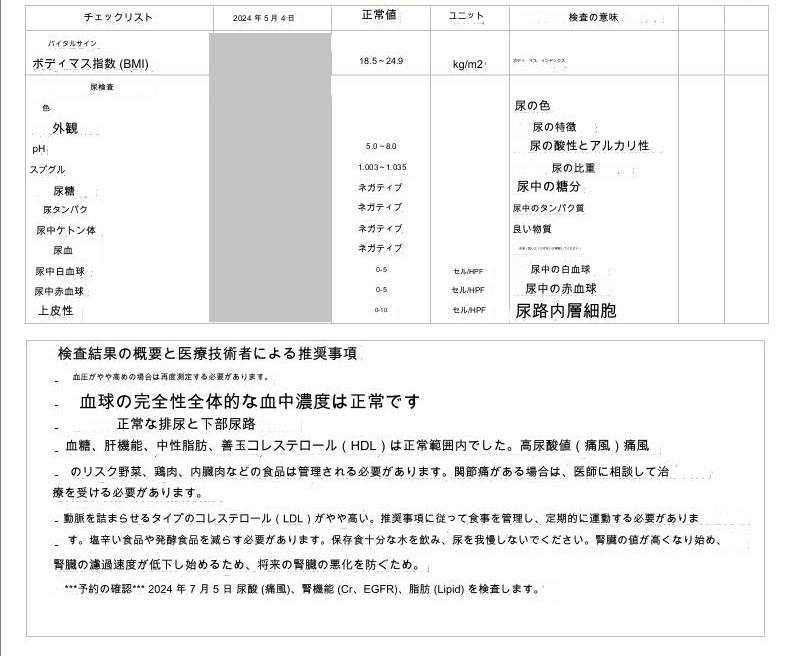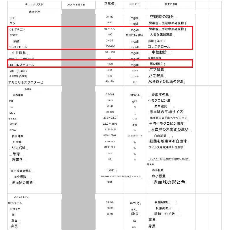 検査結果:尿酸、クレアチニン、EGFR、悪玉コレストロールが異常値