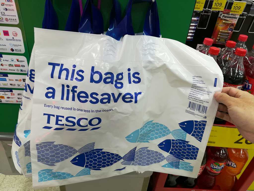 レジ近くには有料のエコバック(大?5バーツ、小?3バーツ)とゴミ用のポリ袋が並べられていて居ますが、あまり使っている人を見かけません。