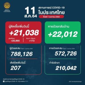 んでんでタイの新型コロナ新規感染者は21038人、死者207人でした。