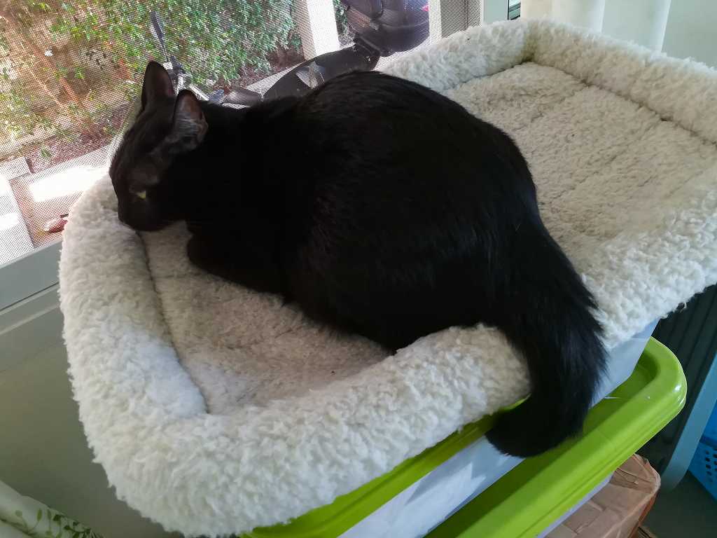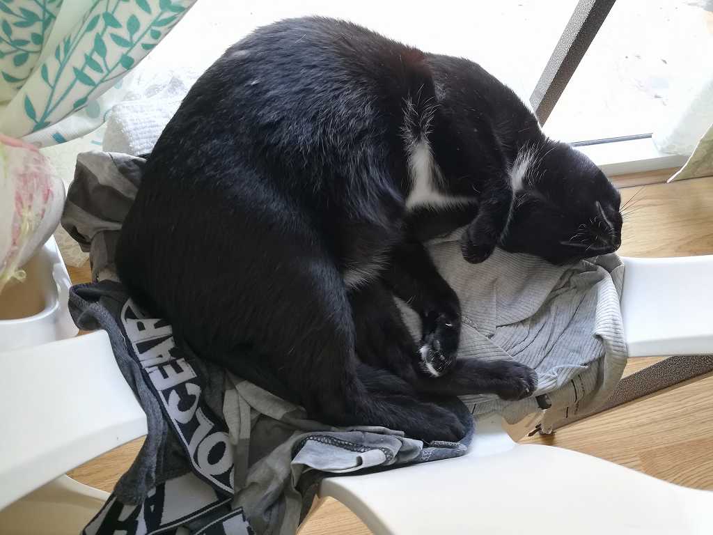 点滴の準備をしようと部屋に入ると、黒猫ココロは外が見える椅子の上で気持ちよさそうにお昼寝中です。