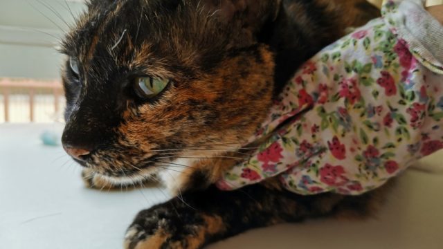 で、膀胱炎のサビ猫プルさんの自宅療養で朝10時に飲み薬3個の投薬にチャレンジ!