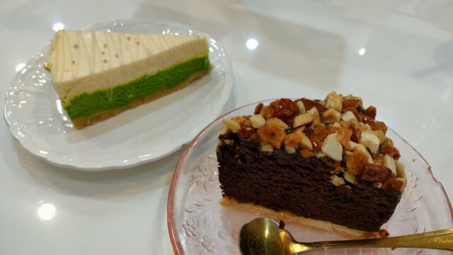抹茶レアチーズケーキとアーモンドケーキだったかな。各80バーツの合計160バーツ。