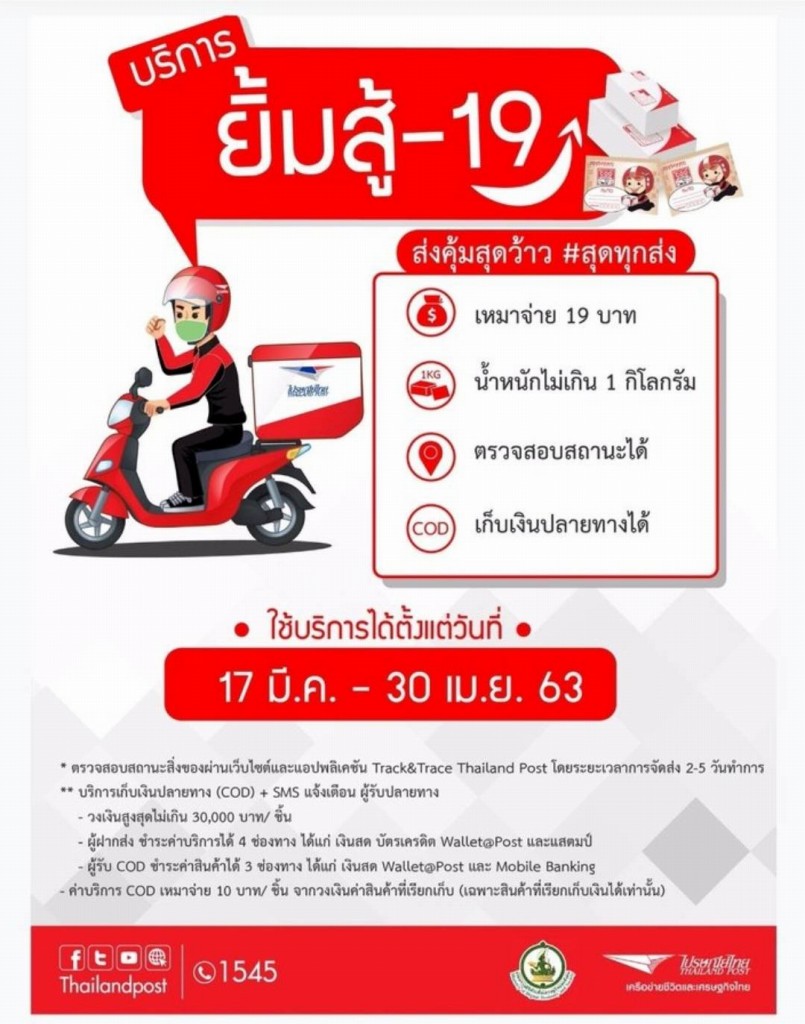 新型コロナウィルスによる、自宅待機が増えることでインターネットによる通販の需要が増えると予想したタイの郵政局は4月30日まで期間限定で宅配郵便の料金を値下げしました。