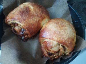 都合、大きなロールパンみたいなものが4つ出来上がり、乾燥しないようにパン生地表面を水で濡らして40分ほど寝かせて、180度のオーブンで20分焼けばシナモンロール?完成!
