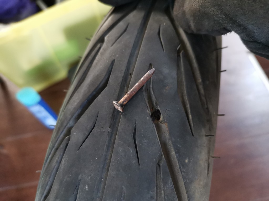 でパンクしたタイヤをチェックすると溝部にしっかりと刺さった釘を発見!