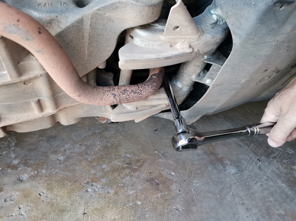ネジの後ろ側から潤滑剤を吹きかけて、ラチェットをハンマーで殴ってようやく緩んだ。