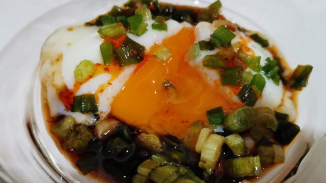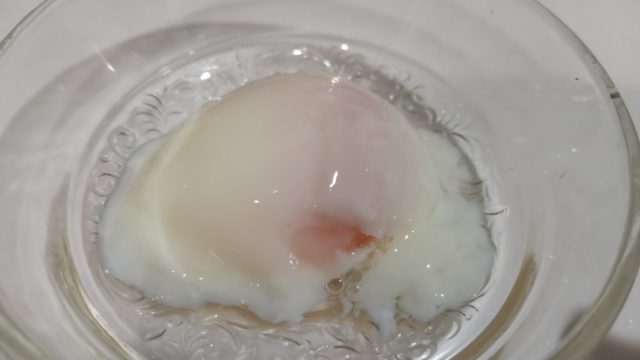 殻を割った姿はしっかり温泉卵です。でも黄身は固まる前の少し半熟で加熱温度が少し低かった模様。黄身は70℃で固まるので湯煎が70℃手前だったみたい。