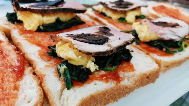 いつもは卵とハムだけど、今回は見切り品で購入したほうれん草が冷凍保存されていたのでにんにく塩コショウで軽く炒めていれてみた。