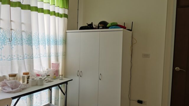 今日のココロさんはタンスの上に避難中で点滴の準備をする前に捕まえ床に下ろす。
