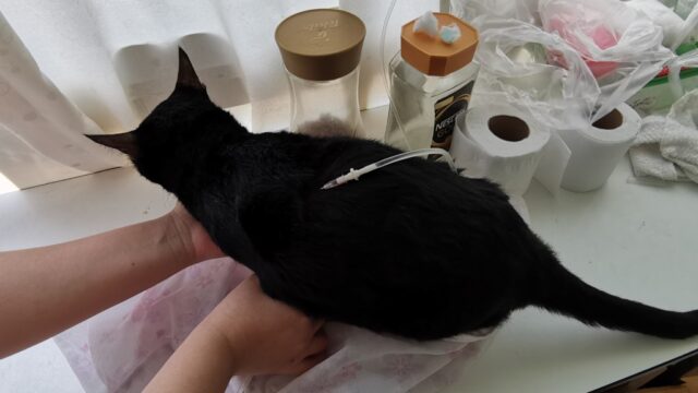 昼過ぎに腎臓ケア中の黒猫ココロに皮下点滴を実施。皮下点滴をするとオシッコが大量に出るので猫砂の消費が凄いです。
