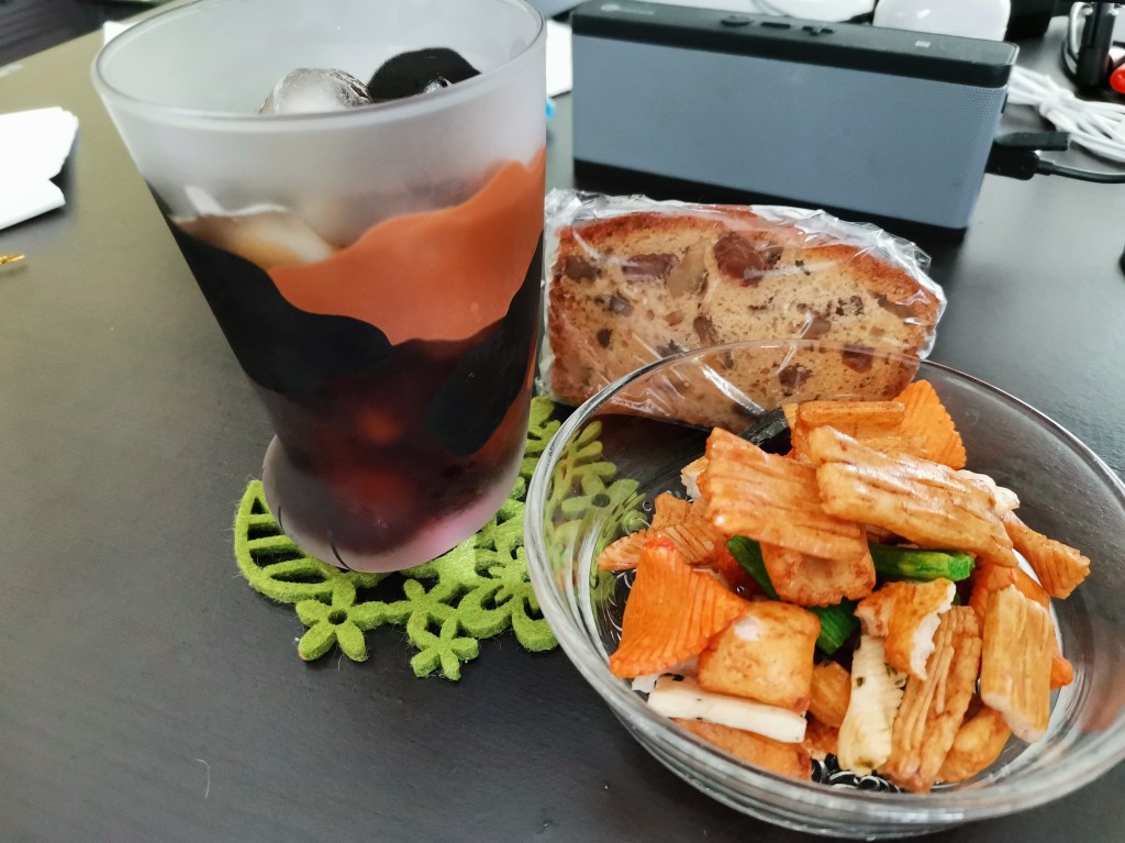 急冷ドリップのアイスコーヒー、自家製パウンドケーキ、あられの甘辛苦いのコラボ最高です。