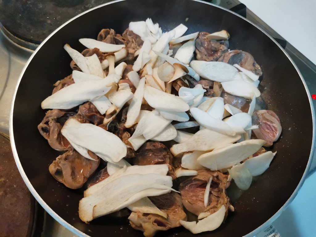 ニンニク、エリンギを入れて炒め煮にして、味付けは創味シャンタンと山椒で完成。