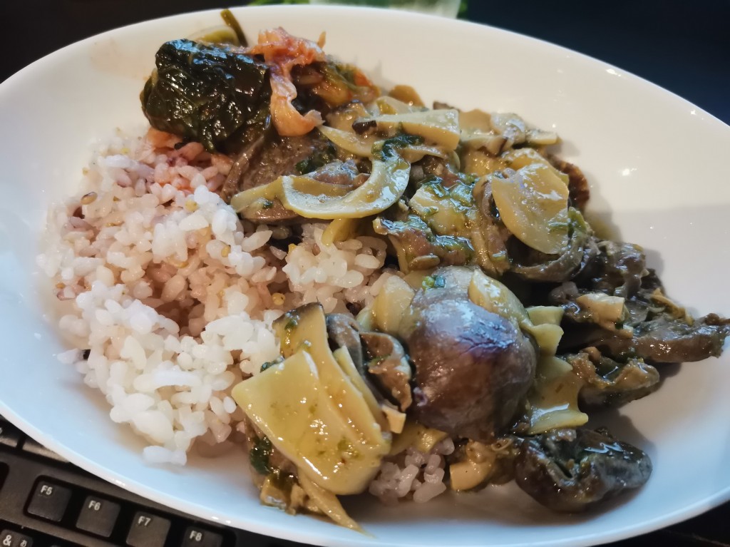 ニンニク、エリンギを入れて炒め煮にして、味付けは創味シャンタンと山椒で完成。